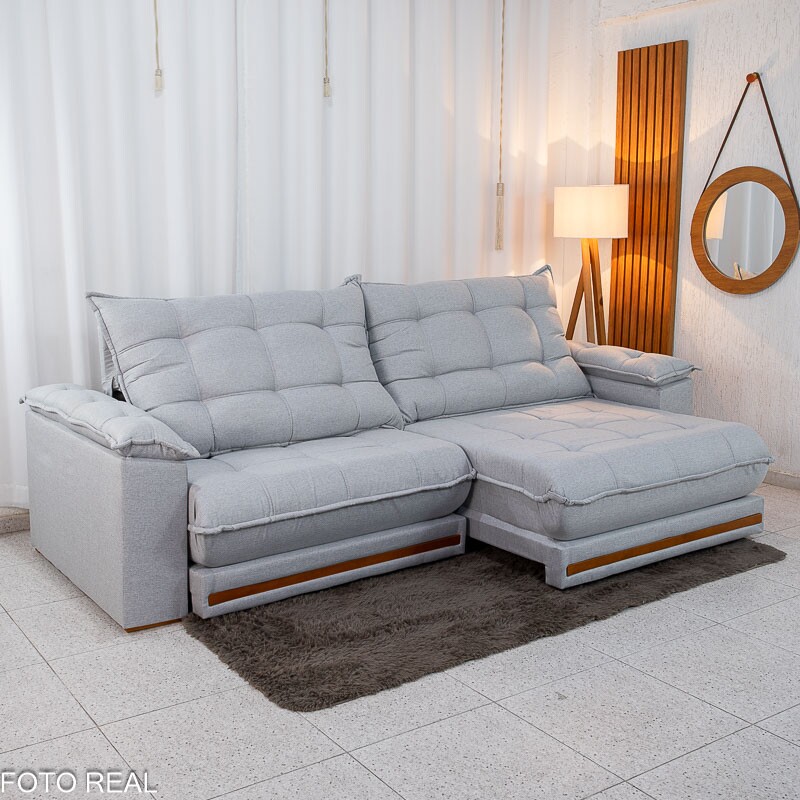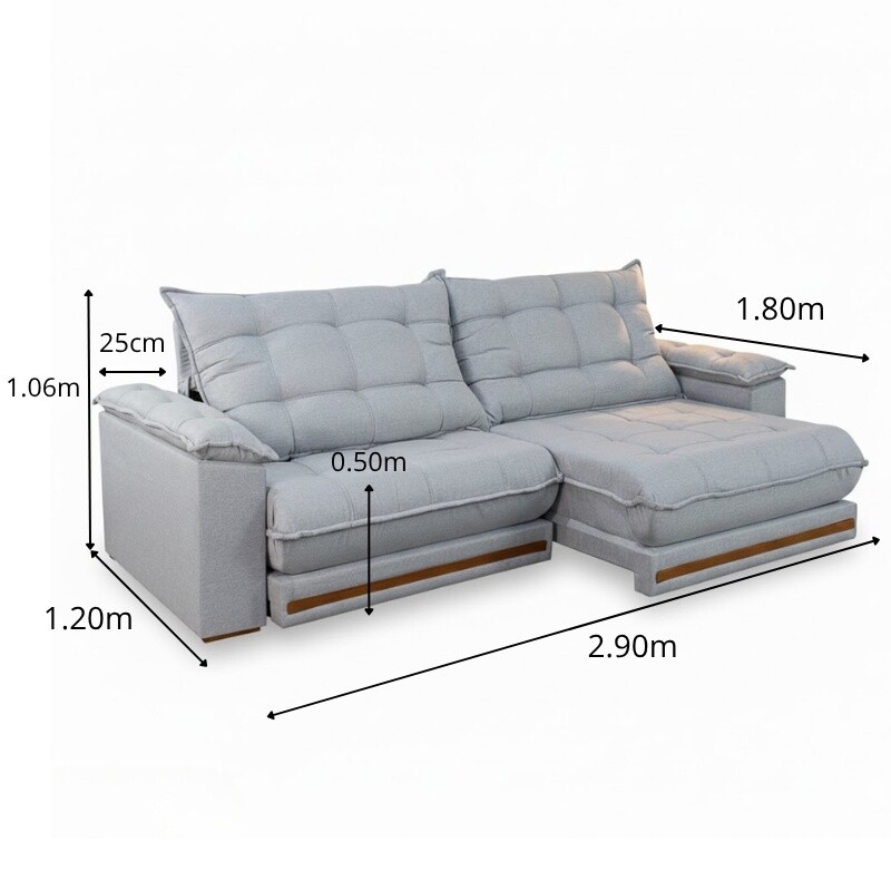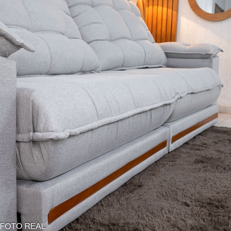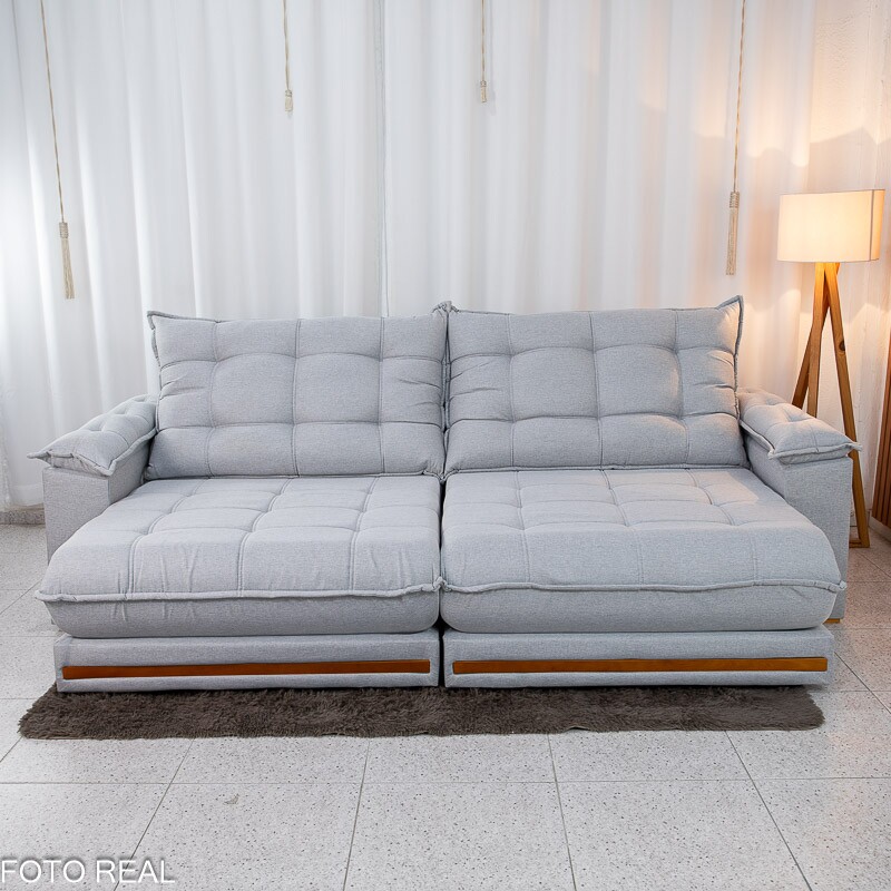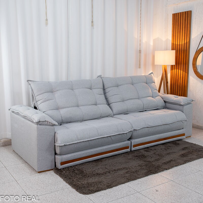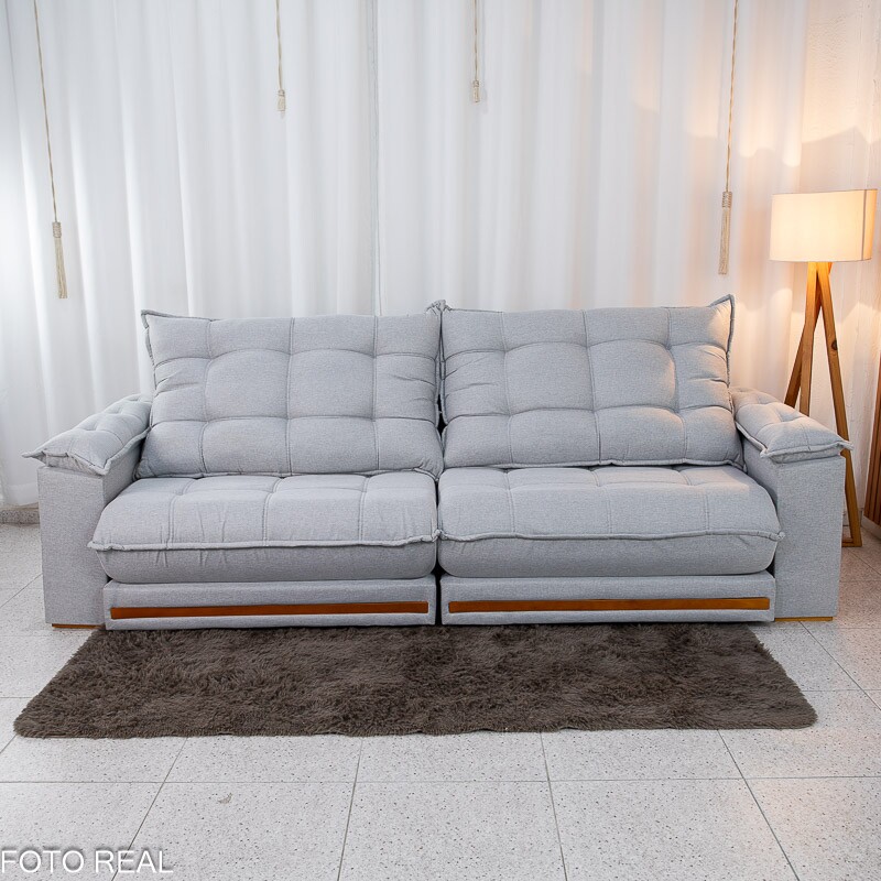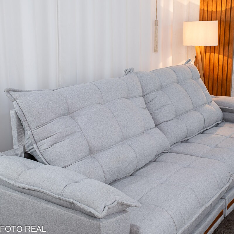 Sofá Retrátil Reclinável Barcelona 2.90m Linho Cinza Claro 461 - D33 e Molas Ensacadas R$ 2.469,00em até 10x de R$ 259,25 no cartão ou R$ 2.370,24 com 4% de desconto em dinheiro Comprar Sofá Retrátil Reclinável Barcelona 2.90m Linho Cinza Claro 461 - D33 e Molas Ensacadas Assista ao vídeo X EM ESTOQUE Referência: 061354578 Restam apenas 3 unidades Faça Login/Cadastro para ter acesso ao preço deste produto. R$ 2.469,00em até 10x de R$ 259,25 no cartão ou R$ 2.370,24 com 4% de desconto em dinheiro Reservar Esse produto encontra-se indisponível. Deixe seu contato que avisaremos quando chegar. Seu nome: Seu e-mail: Desejo receber e-mails com lançamentos e promoções. Avise-me quando disponível Indicar este produto Descrição Sofá Retrátil Reclinável Barcelona 2.90m Linho Cinza Claro 461 - D33 e Molas EnsacadasMedidas:- Largura: 2.90m- Altura: 1.06m- Assento fechado: 1.20m- Assento aberto: 1.80m- Altura do assento até o chão: 0.50m- Largura dos braços: 0.25m- Sofá retrátil para até 6 pessoas- Passa em portas de 0.75mAssento:- Tipo: Retrátil com corrediças em tubo de ferro- Pillow Top: 30 cm de espessura parte frontal- Espuma: D33 Alta Densidade- Molejo: Molas ensacadas Pocket individuais- Sustentação: Percintas elásticas de alta resistência- Rodízios: Rodinhas siliconadas que facilitam o deslizamento- Detalhe: Rodapé frontal em madeira maciça.Encosto:- Tipo de encosto: Reclinável com várias posições- Enchimento: Fibra de poliéster siliconado de alto conforto- Sistema de inclinação: Catraca de ferro blindadoBraços:- Pillow top fibra de poliéster siliconadoEstrutura:- Tipo de madeira: Eucalipto de reflorestamentoRevestimento:- Tecido: LinhoPeso indicado:- Recomendado até 140 kg por pessoaAviso importante:Informamos que é normal haver uma abertura entre os módulos dos sofás retráteis. Essa abertura é necessária para evitar atrito entre os módulos durante o movimento de abrir e fechar, prevenindo o desgaste do tecido.As cores podem sofrer variações dependendo da luminosidade, tipo de câmera, ou mesmo a visualização das imagens em computadores ou notebooks com telas LCD ou LED, tablets ou smartphones dependendo da quantidade de pixls, podendo deixar as imagens com cores mais opacas ou cores mais vibrantes.