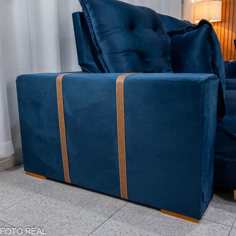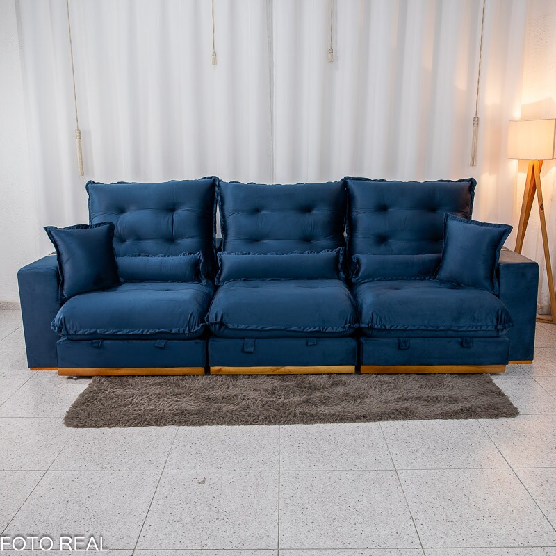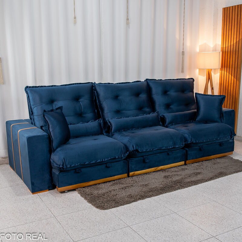 Sofá Retrátil Reclinável Mônaco 3.20m Veludo Azul A16 - Molas Ensacadas R$ 2.516,00em até 10x de R$ 264,18 no cartão ou R$ 2.415,36 com 4% de desconto em dinheiro Comprar Novidade Oferta Sofá Retrátil Reclinável Mônaco 3.20m Veludo Azul A16 - Molas Ensacadas EM ESTOQUE Referência: 063004515 Restam apenas 1 unidades Faça Login/Cadastro para ter acesso ao preço deste produto. R$ 2.516,00em até 10x de R$ 264,18 no cartão ou R$ 2.415,36 com 4% de desconto em dinheiro Reservar Esse produto encontra-se indisponível. Deixe seu contato que avisaremos quando chegar. Seu nome: Seu e-mail: Desejo receber e-mails com lançamentos e promoções. Avise-me quando disponível Indicar este produto Descrição Sofá Retrátil Reclinável Mônaco 3.20m Veludo Azul A16 - Molas EnsacadasMedidas:- Largura: 3.20m- Altura: 1.14m- Assento fechado: 1.25m- Assento aberto: 1.80m- Altura do assento até o chão: 0.50m- Largura dos braços: 0.25m- Caixa Atrás: 0.33m- Sofá retrátil para até 7 pessoas- Passa em portas de 0.75cmAssento:- Tipo: Retrátil com corrediças em tubo de ferro- Espuma: D28 de alto conforto- Molejo: Molas ensacadas Pocket individuais- Pillow top: Com 25 cm com alça discreta na parte inferior, facilitando a abertura do assento com praticidade- Sustentação: Percintas elásticas de alta resistência- Corrediças: Tudo de ferro com sistema de freio- Rodinhas: Siliconada- Peso indicado: Até 120kg por pessoa.Encosto:- Tipo de encosto: Reclinável com várias posições- Enchimento: Fibra de poliéster siliconado de alto conforto- Sistema de inclinação: Catraca de ferroBraços:- Linha reta com cinto decorativoEstrutura:- Tipo de Madeira: Eucalipto de reflorestamento com tratamento anticupim e na são usados grampos galvanizadosRevestimento:- Tecido: VeludoBônus:- Acompanha três rineiras é duas almofadas decorativasAviso importante:Informamos que é normal haver uma abertura entre os módulos dos sofás retráteis. Essa abertura é necessária para evitar atrito entre os módulos durante o movimento de abrir e fechar, prevenindo o desgaste do tecido.As cores podem sofrer variações dependendo da luminosidade, tipo de câmera, ou mesmo a visualização das imagens em computadores ou notebooks com telas LCD ou LED, tablets ou smartphones dependendo da quantidade de pixls, podendo deixar as imagens com cores mais opacas ou cores mais vibrantes. Benefícios das molas ensacadas
